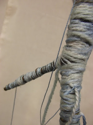 One of my favourite pieces that we have made for this performance is the Sea Guardians cloak. In the story the sea guardian has become trapped in discarded plastic waste and fishing nets and in struggling to escape he is creating huge waves and terrifying the fisherman. To represent the waste he is trapped in we used my favourite technique of crocheting and melting plastic bags to create a large net like cloak that the actor wears. We added further strings of crocheted plastic to give a really tangled up look and add movement. I think this piece of costume works really well and I'm looking forward to seeing it in action.